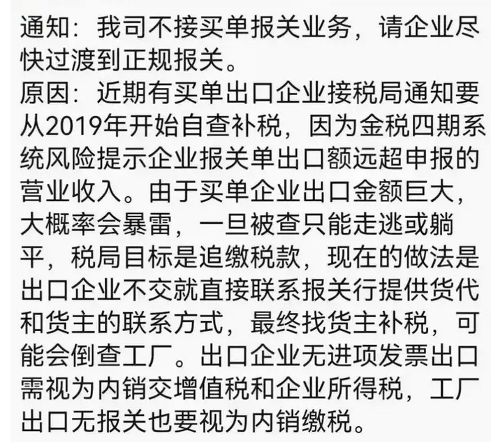 最近,深圳某报关行接连发出通知,不再接买单报关业务。同时也提醒企业要尽快过渡到正规报关。买单报关带来的影响不容忽视,随着金税四期的不断完善,买单出口的跨境电商大数据稽查要求自行补税,除了调查报关行最终还会追查到货代和货主,查到的货主要求按照贸易额的13%补交增值税以及25%企业所得税。