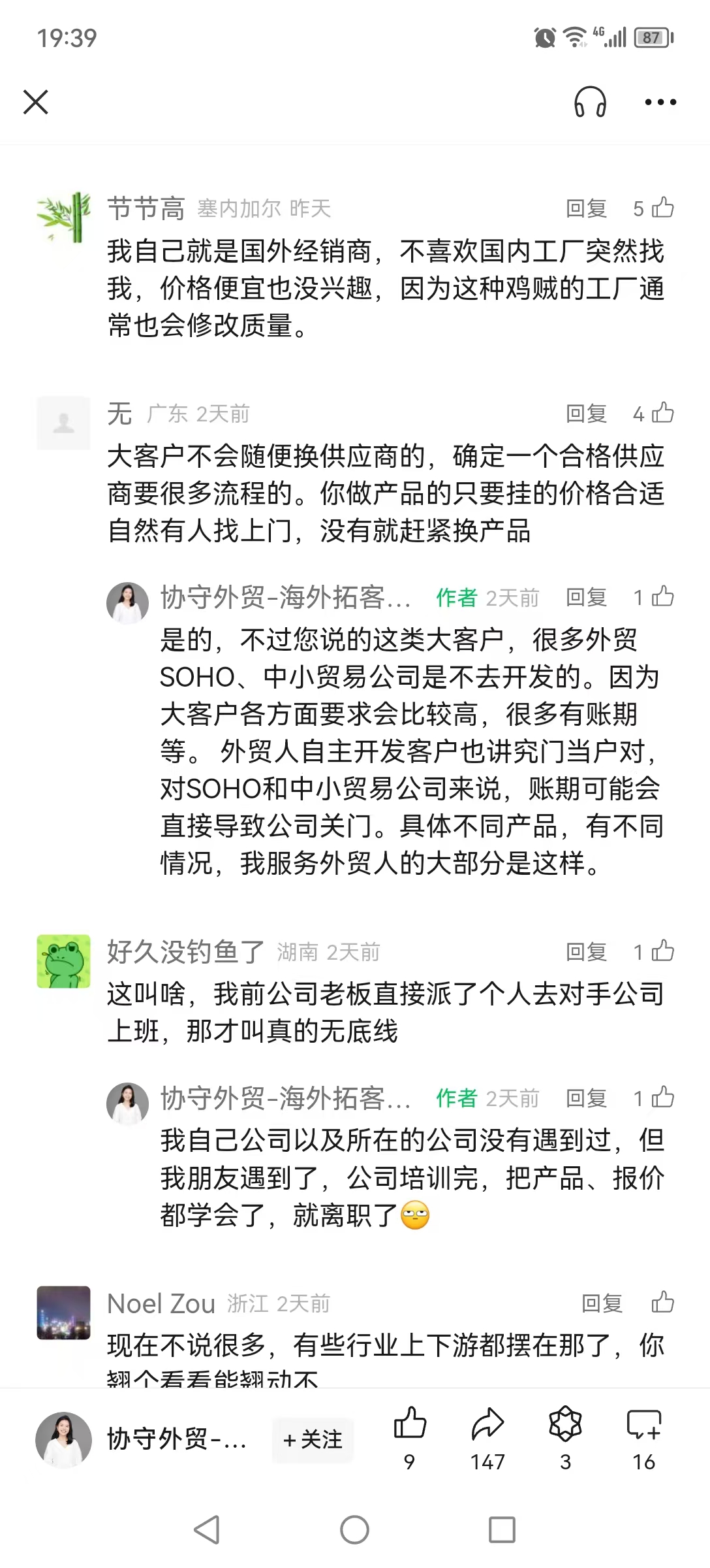 他们反而羡慕工厂业务员,还是大多数. . . .单子没成一一眼,。自连个工厂都没,价格肯定不如人家啊;客户要资质-一没一个工厂给的客户都跑了;客户要打视频一一不是工厂不敢接;外贸公司的业务员最大的优势在于从领导到部门都会齐心协力解决客户的所有需求。无论什么品都接,客户的综合体验很高,但是外贸公司在没有找到自己的产品定位之前,综合体验反而不是优势价格才是优势。公司因为抛弃了生产端,直接对接客户,所以
