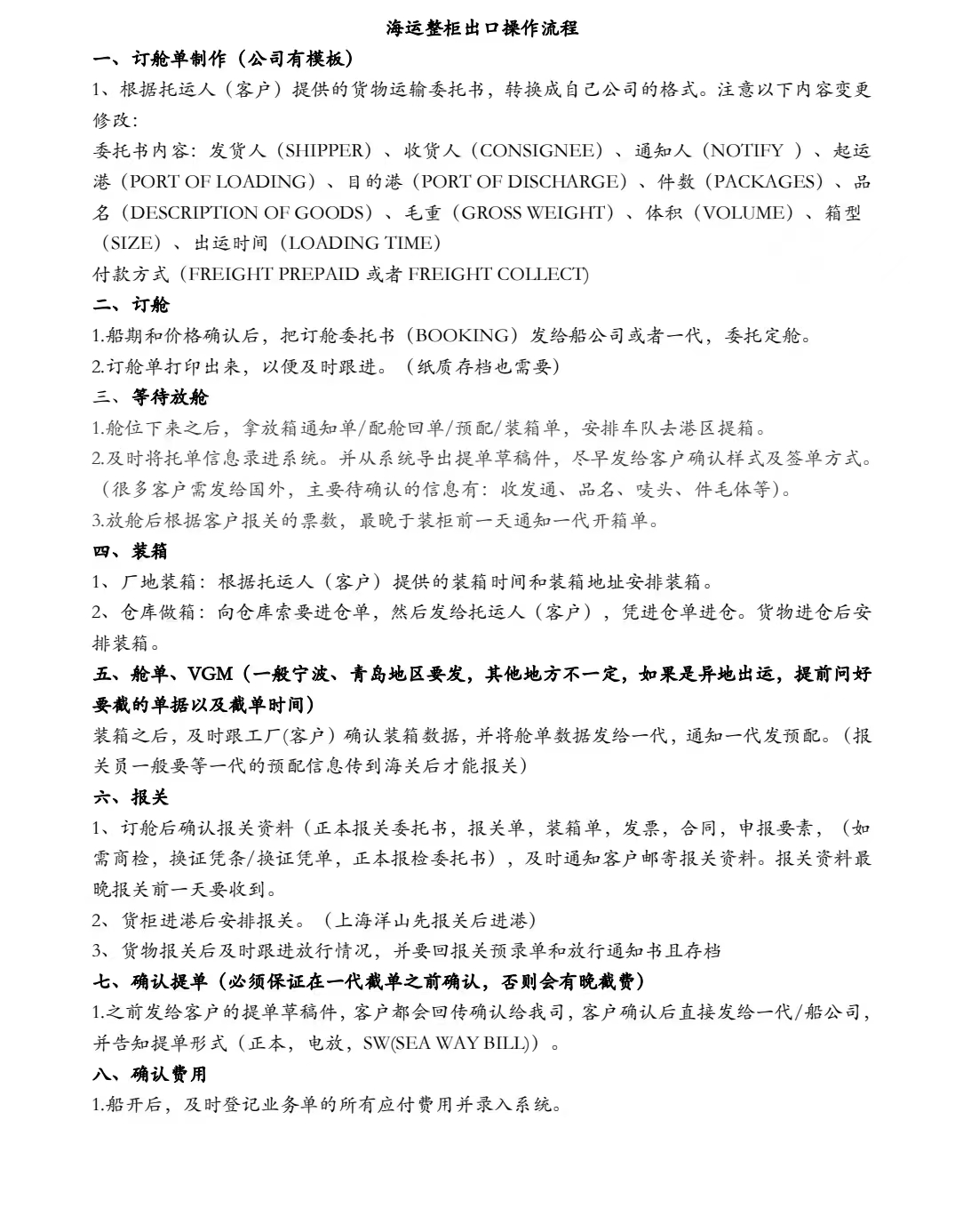 工厂把发票、箱单、报关委托、出口收汇核销单给货代,并告知出货日期--------货代根据出货的发票、箱单向船公司订舱BOOKING,并安排时间报关,如果要商检,先要做商检------------货代根据船公司的提单,制作自己的分提单,分票的是和报关的数目是一样,箱数,重量---------货代向工厂发出指令,让工厂将货送到指定的地点装箱(船公司根据箱数重量制作仓单,并进行申报),报关行接到相关的单据向海关申报------------海关审核相关的发票、箱单、报关单、仓单、提单复印件、报关委托、出口收汇核销单后--------通关--------------工厂拿出口收汇核销单退税